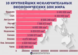 Россия находится на 4 месте по площади своей экономической зоны. Исключительная экономическая зона — область морского пространства протяженностью до 200 морских миль (370 км) от сухопутного побережья страны. Самой большой исключительной экономической зоной обладает Франция, в первую очередь благодаря своим заморским территориям. Подробнее текст и изображение Геостатистика